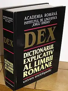 Dicționarul explicativ al limbii române ("The Explanatory Dictionary of the Romanian Language", known under the abbreviation of DEX) is the most important dictionary of the Romanian language, published by the Institute of Linguistics of the Romanian Academy (Institutul de Lingvistică "Iorgu Iordan – Al. Rosetti").