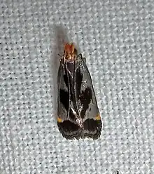 The length of the forewings is 5.4–6.5 mm (0.21–0.26 in).[4] The forewings are deep brown, with a steel-blue, shining streak along the costa, extending from the base to an orange-yellow costal spot at the beginning of the apical cilia, and deeply excised in the middle of the wing. Beneath the excised portion and near the inner margin is a short, steel-blue streak, and the costal streak emits a slender line to the inner margin, opposite the costal orange-yellow spot. The hindmargin has a series of steel-blue dots. The hindwings are fuscous.[5] Adults are on wing from June to August.