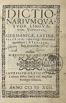 Dictionarium quatuor linguarum[notes 1] (The Dictionary of Four Languages) is a 16th-century book by the German polymath Hieronymus Megiser that includes a multilingual dictionary and a multilingual grammar of Italian, Slovene, German,[2] and Latin. It also includes some Croatian words.[3] It was compiled and published in 1592 in Graz (Austria), then part of the Habsburg monarchy. The dictionary is the first multilingual dictionary of Slovene. The appendix, named Exempla aliquot declinationum et coniugationium (Some examples of declensions and conjugations) contains some grammar of the included languages and has been recognised as the second grammar of Slovene and the first multilingual grammar that includes Slovene.[4] The book marks the beginning of Slovene lexicography.[5] An extended edition was published under the same title in 1744 at Klagenfurt (Austria) by the Jesuits. This second edition also contains example phrases in German and Slovene, illustrating the use of the entries given. The number of Slovene equivalents in this edition is notably higher; they often reflect Carinthian Slovene.