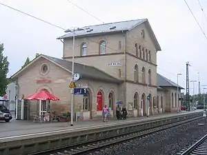 The Rhine-Main Railway was built by the Hessian Ludwig Railway (Hessische Ludwigsbahn) and became operational on 1 August 1858. The well-preserved station building was built in the style of romantic neoclassicism between 1861 and 1863. The round-arched windows are significant. The station building is listed as a monument under the Hessian Heritage Act.