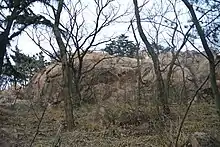 The Diederichs's stone (German: Diederichsstein, Chinese: 迪特里希碑; pinyin: Dítèlǐ Xībēi) was a German monument in the city of Qingdao to commemorate Admiral Otto von Diederichs and the German occupation of the Kiautschou Bay concession on 14 November 1897. The monument was dedicated on 21 November 1898 by Prince Henry of Prussia.[1] It was located at an elevation of 98 m, about halfway up the southwestern slope of the Signal Hill, the official German name of the mountain at the time was "Diederichsberg".[2] Its most prominent feature was a plate decorated with the imperial eagle of the German Empire and the inscription "For him who won for Kaiser and Reich the land all around, let this rock be named Diederichs's stone" ("Der hier für Kaiser warb u. [und] Reich ringsher das Land, nach ihm sei dieser Felsen Diederichsstein genannt").[3] Below the plate was a rock inscription that read, "In this place on 14 November 1897, Admiral v.[von] Diederichs took possession of the Kiautschou territory" ("Am 14. November 1897 ergriff an dieser Stelle der Admiral v.[von] Diederichs Besitz vom Kiautschou Gebiet"). A separate Chinese inscription was located to the right-hand side of the German text. The entire monument stood about 5 meters tall.