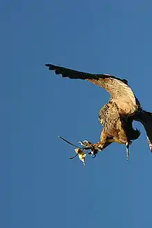 The Eurasian eagle-owl predates the largest members of the most species-rich diurnal raptor genera: the 900 g (2.0 lb) northern goshawks from the genus Accipiter, the 1,375 g (3.031 lb) upland buzzards from the genus Buteo and the 1,460 g (3.22 lb) gyrfalcons (F. rusticolus) of the genus Falco.[124] Additional large raptors, i.e. those that can average 1,000 g (2.2 lb) or more in body mass, taken as prey include 1,485 g (3.274 lb) osprey (Pandion haliaetus), the 1,080 g (2.38 lb) red kites (Milvus milvus), and the rough-legged buzzards (Buteo lagopus) and saker falcons (Falco cherrug), in both of which females average more than 1,000 g (2.2 lb).[2][60][151][152][153][154] The taking of rough-legged buzzards and snowy owls must be confined to full-grown victims, since they nest further north than Eurasian eagle-owls.[2] Eurasian eagle-owls also hunt the smallest raptors available, including those such as lesser kestrels (Falco naumanni) and Japanese sparrowhawks (Accipiter gularis) that weigh less than 150 g (5.3 oz).[88] Some of these are cases of eagle-owls killing nestlings or fledglings but they can easily overtake adult buzzards, goshawks and falcons of any size.[2]