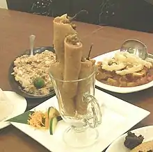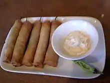 It is eaten as is or dipped into common lumpia dipping sauces like banana ketchup, sweet and sour sauce, garlic mayonnaise, honey mustard, or vinegar with labuyo peppers and calamansi.[1][9][11] It is usually eaten as an appetizer or as pulutan (finger food) with beer or other alcoholic drinks.[5][1]