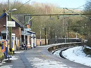 Immediately adjacent to the station is the Dinting viaduct, where three people were killed in an accident in September 1855.[2] Another accident south of the station, in 1906 on the Glossop branch, resulted in 20 passengers and 3 members of train crew being injured when two trains were involved in a rear-end collision.[3] A derailment of a freight train took place along the then eastbound Hadfield platform on 10 March 1981, shortly before the Woodhead's closure, destroying much of its original structure.[4]