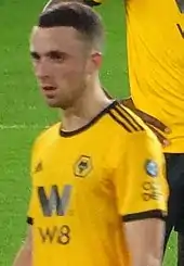 Jota made his debut in the Premier League on 11 August 2018, playing the full 90 minutes in a 2–2 home draw against Everton.[25] He scored his first goal in the competition on 5 December, helping the hosts come from behind to beat Chelsea 2–1.[26] His second came four days later, in a win at Newcastle United by the same scoreline.[27] On 19 January 2019, Jota scored three times in the 4–3 home victory over Leicester City – his second career hat-trick.[28] In the process, he became only the second Portuguese player to achieve the feat in the Premier League after Cristiano Ronaldo 11 years earlier.[29] This was a first-ever for the club in the competition and a first for the club in the top flight of English football since John Richards, against the same opposition, in the Football League First Division in October 1977.[30] On 16 March 2019, Jota scored the winning goal in a 2–1 win against Manchester United in the 2018–19 FA Cup, to help Wolves reach their first semi-final in the competition since 1997–98.[31]
