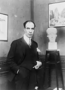 His first master was the "imaginary sculptor" Fernando Caldas, whose workshop was next to Diogo de Macedo's house and from whom he learned the rudiments of drawing and modeling. In 1902, he enrolled in the Academia Portuense de Belas Artes but failed for "inattention to study"[1] and thus interrupted his studies. However, he continued to attend the Escola Industrial Infante D. Henrique and in 1906 he returned to the Academy in 1905, being a student of Teixeira Lopes. He finished the course in 1911 and that same year left for Paris at his family's expense. He attended the Academies of Montparnasse, namely the Académie de la Grande Chaumière, where he was influenced by Bourdelle's classes; and attended for a few months, the National School of Fine Arts.[2][3]