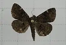 Forewings steely greyish black, and marked with black, including prominent discal spots. A larger white mark on the forewing costa can be seen sometimes. There is an irregular black submarginal line which is expanded into blocks sub-dorsally and at one third from the costa, with a smaller block on the costa. Hindwing with a longitudinal rectangle. The caterpillar is a fungus feeder. It is dirty white with indistinct pink marbling. A pink spot is found dorsally at the rear of each segment. The head lacks setae, but with glossy tubercles. Pupation begins on a tree or the fungus in a tight-fitting cocoon which is semi-ovoid in shape.[5]