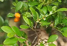 The plant grows as a small tree or shrub, with stiff, glossy, discolorous leaves. Fruit are oval and bright yellow, orange when ripe.