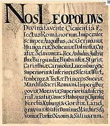 The Diploma Leopoldinum was a legal document which determined the basic principles of the government of the Principality of Transylvania within the Habsburg Empire.[1][2] The diploma was drafted by Miklós Bethlen, Chancellor of Transylvania.[3][4] The Holy Roman Emperor, Leopold I, sanctioned it in Vienna on 16 October 1690.[5] The diploma announced on 4 December 1691. The diploma restored civil administration in the principality, and confirmed the traditional liberties of the Three Nations of Transylvania, including the freedom of the four "received" religions.[6][7]