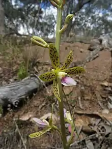 Dipodium hamiltonianum, commonly known as yellow hyacinth-orchid,[2] is a leafless mycoheterotroph orchid that is endemic to eastern Australia. It has up to twenty five greenish flowers with dark red spots on a tall flowering stem.