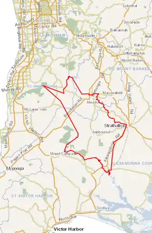 The council lay either side of Bull Creek Road,[1] in the south, and Dashwood Gully Road, the north, for much of their length, including within its bounds the towns of Ashbourne, Meadows and Finniss as well as the smaller settlements of Paris Creek, Bull Creek, Prospect Hill, Blackfellows Creek, McHarg Creek, the historic settlement of Dashwood Gully, and the localities of Mount Observation and Mount Magnificent on the southern boundary.