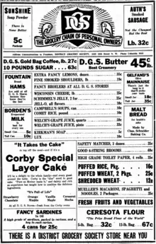 The District Grocery Society started in 1921 with 20 members. Meeting in Mike Hornstein's store, these store owners organized a cooperative organization to stop declining sales and avoid closure of their stores.[3] The cooperative was originally named District Grocery Society, as visible in its early advertisements. In 1928, the name was changed to District Grocery Stores while retaining the same initials, D.G.S.[4]
