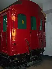In August 1903 orders were placed for 420 cars, enough for 60 x 7-car trains, to allow the whole of the District Railway to be electrified. Brush and Metropolitan Amalgamated made 140 cars in England, the remainder were made in Belgium and France, and electrical equipment was installed on arrival at Ealing Common Works in 1905.[4] The cars were 49 ft 6+1⁄2 in (15.1 m) long, 8 ft 10+1⁄2 in (2.71 m) wide at the cant rail and 12 ft 3+1⁄4 in (3.74 m) high from rail level.[5] Access was by sliding doors, double in the centre and single at the ends. The doors were initially pneumatically controlled, but this proved unreliable, and from 1908 the doors were hand operated by the passengers.[6] These hand-operated sliding doors were often left opened in warm weather, and passengers would open doors on moving trains in an attempt to jump on.[7] First- and third-class accommodation was provided in open saloons,[4] seating covered with rattan in third class and plush in first. Electric lighting was provided.[8]