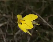 Diuris subalpina, commonly known as slender golden moths[2] is a species of orchid that is endemic to south-eastern continental Australia. It has two linear leaves and up to three bright yellow flowers with very fine, reddish streaks.