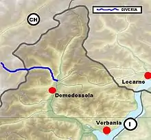 The Diveria (Walliser German: Churumm Bach;[2] German: KrummBach) is an Alpine river which flows through Switzerland (Canton Valais) and Italy (Province of Verbano Cusio Ossola). It is a tributary of the Toce and therefore, via Lake Maggiore and the Ticino, of the Po. The valley crossed by the Diveria, the Val Divedro, is the only one in the Valais to form part of the Po basin rather than that of the Rhône.