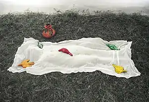 Diwan has pushed the boundaries of photography by developing a technique of combining painting, acting, and photography to narrate his personal impressions and experiences of the world in and around him. He creates a three-dimensional immersive environment in which there is a painting in the backdrop, actors whose bodies are painted and props[14] created specifically around the themes he is working on (in the series Violence, Waking the Dead, Shores of the Unknown and After the Turmoil).[18] This temporary installation of various elements is photographed on a transparency film which is further exposed in the darkroom on a normal photographic paper by controlling the rendition of images with the play of filters.[17]