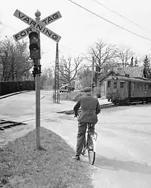 Djursholms Sveavägen seen from across Sveavägen, with the roof of the station building seen behind the train. The biker stands waiting at Henrik Palmes allé, the car is parked on Stockholmsvägen.