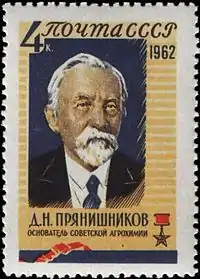 Dmitry Nikolayevich Pryanishnikov (Russian: Дми́трий Никола́евич Пря́нишников; 6 November 1865 — 30 April 1948[1]) was a Soviet and Russian agrochemist, biochemist and plant physiologist, founder of the Soviet scientific school in agronomic chemistry. Hero of Socialist Labour (1945).[2] Winner of Lenin Prize (1926), Stalin Prize (1941) and Timiryazev Prize (1945).[3]