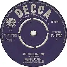 "Do You Love Me" was released as a single in late August 1963, with the B-side, "Why Can't You Love Me", written by Tremeloes guitarist Alan Blakley. The single had been intended for release in late September, but was rush-released on 31 August to capitalise on the success of "Twist and Shout" and to combat a version by fellow beat group the Dave Clark Five which was set for release on 6 September.[28] "Do You Love Me" topped the four main music paper charts in the UK and became the group's only number one before the departure of Brian Poole in 1966, after which they achieved a further number one with "Silence Is Golden" in 1967.[32] "Do You Love Me" sold over 250,000 copies and was awarded a silver disc by Disc.[33]
