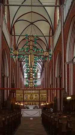 The double sided cross altar and the Lettnerwand, taller than a human, divided the monks`choir pews in the eastern part from the lay brothers' seating in the western part. The altar was probably created under the supervision of a Bohemian or south German master builder, with the help of north German master Bertram von Minden. The time of creation is dated 1360-1370. It is the most monumental of its kind in Europe. For the dedication of the church in 1368 the greater part of it was probably finished.
