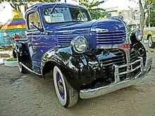 After the war, both the 112-ton pickup, and the long one-ton pickup with the nine-foot bed were dropped.[8] Post-war available equipment options included a larger clutch, four-speed transmission, oversize tires, electric driver's wiper, heater, chrome windshield frame, adjustable visor, driver's armrest, dome light, turn signals, "airfoam" seat with leather upholstery, and an AM radio.[7]
