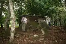 Dolmen de Axeitos is a prehistoric megalithic dolmen just to the northwest of the village Axeitos, in the parish of Oleiros, in the municipality of Ribeira, on the Barbanza Peninsula in the estuary of the Ría de Arousa in the Province of A Coruña, Galicia, in northern Spain. It is dated to 3600-4000 BC. Because of its historical and archaeological value, on March 11, 1978 it became a registered Bien de Interés Cultural landmark.