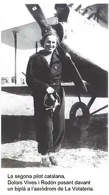 Dolors Vives i Rodon, also Lolita Vives, (15 August 1909 – 12 June 2007) was a pioneering Spanish aviator. A founding member of the Club Aereo de Barcelona, in May 1935 she became the second Catalan woman to pilot an aircraft, receiving Licence No. 217 from the aeronautical authorities. During the Spanish Civil War, she flew for the Republican armed forces.[1][2]