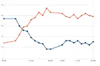 Nicolas Sarkozy had a maximum popularity between August and October 2007: during this period, the number of people trusting him was higher than 55% according to BVA[9] and CSA,[10] higher than 60% for Ipsos,[11] and reaching almost 65% for TNS Sofres.[12] His popularity began to fall rapidly from October and November 2007. From February and June 2008, it maintained at very low levels, between 30 and 40 according to all opinions studies. In summer 2008, it rose again until the end of the year, when the popularity level was close to 50% (40% only for TNS Sofres). In 2009, it maintained between 40 and 45%.