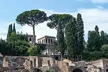 The Domus Tiberiana was an Imperial Roman palace in ancient Rome, located on the northwest corner of the Palatine Hill. It probably takes its name from a house built by the Emperor Tiberius, who is known to have lived on the Palatine, though no sources mention his having built a residence.[1] It was enlarged by the successors to Tiberius, and would have been the principal Roman residence of Tiberius, Caligula, Claudius, and Nero during the early part of his reign.[2] Relatively little is known of the structure archaeologically, since the Farnese Gardens have occupied the site of the main level since the 16th century, making excavation difficult.[3]