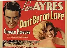 Don't Bet on Love is a 1933 American comedy film directed by Murray Roth and written by Howard Emmett Rogers, Murray Roth and Ben Ryan. The film stars Lew Ayres, Ginger Rogers, Charley Grapewin, Shirley Grey, Tom Dugan and Merna Kennedy. The film was released on July 1, 1933, by Universal Pictures.[1][2][3]