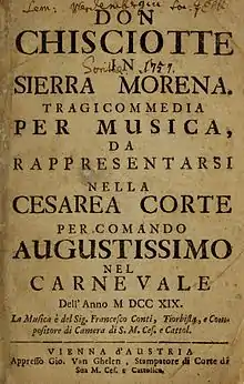The opera's librettists, Apostolo Zeno and Pietro Pariati, had written the librettos for many of Conti's Vienna operas, either individually or jointly. On this occasion they remained quite faithful to the text and basic story recounted Book I of Don Quixote where he travels to the Sierra Morena mountains and has a series of encounters with the wily inhabitants and two pairs of unhappy lovers. Described in the libretto as a tragicomedia per musica (tragicomedy in music), it is essentially a parody of the opera seria genre and its heroic arias.[1]