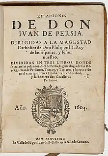 Don Juan was granted an annual pension of 1200 ducats from Spanish king later that year.[7] He also wrote an account of Iran, his involvement there with Shah Abbas I, and his journey to Spain in the Persian embassy to Europe (1599–1602) which was translated and published by a Mercedarian[7] called Alonso Remón under title Relaciones de Don Juan de Persia in 1604, Valladolid. However, a year later both Don Diego and Don Juan were arrested and charged with murder of secretary of Hossein Ali Bey - Bastam Quli.[7] However, the murderer was found later in person of another convert - Francisco de Persia.
