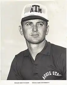 Watson played his high school sports in Franklin, Texas, where he won all-state honors. Don was a 1952 graduate of Franklin High School, graduating salutatorian of his class. During his high school athletic career, he earned 18 letters in sports. Because of Watson's memorable performance, Franklin's Head Coach, Joe Hedrick retired Don Watson’s jersey #17 in 1960.[2] He was recruited to Texas A&M University to play college football by then-head coach Raymond George. At Texas A&M, Watson was a member of the famed Junction Boys under head coach Bear Bryant.[3][4] In 1956, he helped the team finish 9–0–1 and capture its first Southwest Conference championship since 1939.[5] Watson received his Bachelor of Physical Education degree from Texas A&M in 1957.