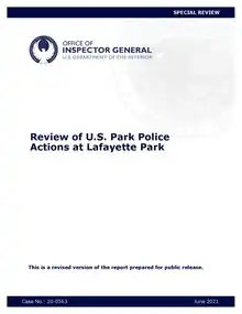 A June 2021 Interior Department Inspector General review of U.S. Park Police actions found that Park Police cleared Lafayette Square as part of a plan to erect fencing.[15][16][17] The Park Police incident commander was reportedly stunned when Barr informed him of Trump's impending visit.[18] That report also confirmed the use of tear gas by D.C. Metropolitan Police, revealed Park Police did not request deployment of Bureau of Prisons to the park, and reported that it was not known why U.S. Secret Service had deployed ahead of schedule, advancing on protesters before the Park Police had a chance to warn protesters to disperse.[19][20][17]: 15 The report also indicated that Park Police commanders could not identify who gave the order to deploy.[17]