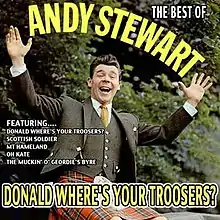 "Donald Where's Your Troosers?" is a comic song about a Scotsman who wears a kilt rather than trousers. It was written by Andy Stewart with music by Neil Grant. When performed by Andy Stewart and the White Heather Group, it was a hit in 1960, reaching number 37 in the UK Singles Chart,[1] and number 1 in the Canadian CHUM Charts.[2] When re-released in 1989, it became an even bigger hit, reaching number 4 in the UK.[3]