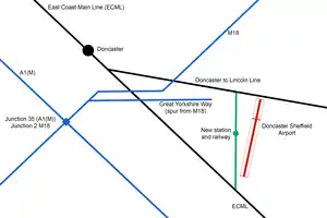 - ↑ "Doncaster Sheffield Airport announces ambition to build rail station connected to ECML". www.railtechnologymagazine.com. 26 March 2018. Retrieved 13 July 2018.