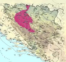 At first, Donji Kraji referred to a region around Ključ on the Sana.[3][4] Marko Vego derives the name of Donji Kraji from the name of Roman province Lower Pannonia, or later Lower Slavonia,[3][5][6] while Pavao Anđelić deduces that the name Donji Kraji (Lower Ends) "also has a certain relation to the rest of (highland) Bosnia", where the terms "Lower" and "End" refers to a border area that is below from the geographical point of view, and in terms of altitude and terrain configuration, in relation to the rest of Bosnia.[7][6] Jelena Mrgić reject existence of "Donji Kraji Slavonije" altogether, and reject previous etymological discussions among historians, such as Klajić, Jiriček and even Vego, and derives the name, similarly to Pavao Anđelić, from geography (altitude and topography) and political demarcation as a product of solely local Bosnian origin.[6] From the 13th century, texts referring to it as "Donji kraji Bosne"[8] or "Donji kraji Bosanski,[6] or "Donji kraji bosanske zemlje".[9][10] During the reign of Hrvatinić family, since the beginning of 13th century, the territory of Donji Kraji included areas and župas around Sana river, Glaž, to Grmeč mountain on the west and to the middle course of the Vrbas river on the east, thus covering entire region of Sanica, and later included Uskoplje, Pliva, Luka, Vrbas, Zemljanik (Resnik), Vrbanja, Tribava (Trijebovo), Mel, Lušci and Banjica, and on occasions Dubica and sometimes even Usora.[11] Vjekoslav Klaić by invoking primary sources and document from 1244, as well as Mrgić, placed the territory of Donji Kraji in northern Bosnia, west from zemlja Usora.[12] This is confirmed by Konstantin Josef Jireček who said: "The Lower Ends (das Unterland) lies in the northwestern (Bosnia) toward Croatia, encompassing Kotor on the Vrbanja, Jajce and Ključ on the Sana (Kotor ander Vrbanja, Jajce, Ključ an der Sana u. S. W.)". From the Bosnian Cyrillic scripts of the written monuments, we know that Lušci village was in the Donji Kraji but this place is not known today.[13]