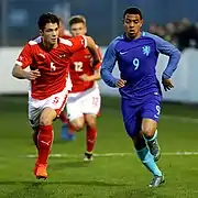 Born in the Netherlands, Malen is of Surinamese descent through his father.[27] At the 2016 Under 17 Euros held in Azerbaijan, Malen played throughout the tournament where the Oranje got to the semi-finals.[28][29][30] He went on to feature for the Netherlands under-18 team.[31] He also was called up, in December 2016, for the Dutch squad for the 2017 UEFA European Under-19 Championship[32][4][31] In March 2017 Malen scored in the 86th minute of an U18 game against Austria to equalise for the Dutch in an eventual 1–1 draw.[33][34][35]