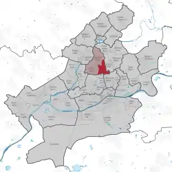 Location of Dornbusch (red) and the Ortsbezirk Mitte-Nord (light red) within Frankfurt am Main