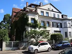 Anne Frank's first residence at Marbachweg 307, where she lived from 1929 to 1931, is located closest to the station "Dornbusch", east of Eschersheimer Landstraße, while her second residence at Ganghoferstraße 24, where she resided from 1931 to 1933, is located between the stations "Fritz-Tarnow-Straße" and "Hügelstraße", west of Eschersheimer Landstraße. Ganghoferstraße is located in the "Dichterviertel" (Poets' Quarter), an upper class neighbourhood where the streets are named after famous poets. In 1933, Edith, Margot and Anne Frank moved to Edith's mother at Pastorplatz 1 in Aachen before settling in Amsterdam.
