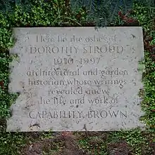 After Stroud died in 1997 her ashes went to Croome Park. A plaque by the statue of Capability Brown records her role in renewing interest in his life and works.