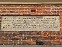 Dorothy Wilson, who died in 1717, left money for the establishment of an almshouse for ten poor women, and a school for twenty poor boys. This was set up in 1719, in her former house, on Walmgate, by the River Foss. The building was replaced in 1765, and rebuilt again in 1812, reusing some materials. In 1810, a schoolmaster's house was built behind the property. The school operated until 1895.[1] In 1958, the building was modified to offer two-room flats, and it continues to operate as an almshouse.[2] The building was grade II listed in 1954.[3] In 2011, the charity operating it merged with the Ellen Wilson Hospital Charity, to form the Ellen and Dorothy Wilson Almshouse Charity.[2]