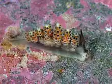 This nudibranch is transparent white with a diffuse, sub-epidermal layer of black pigment which is faint in some specimens and very dense in others. The ceratal tubercles are slightly stalked with globular tips which have a large black spot which is partly obscured by white glands in the terminal tubercle. The digestive gland is usually yellow. The outer half of the rhinophores is black.[5]