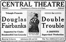 Double Trouble is a 1915 American silent romantic comedy film written and directed by Christy Cabanne, produced by D.W. Griffith, and starring Douglas Fairbanks in one of his earliest motion pictures. The film is based on the novel of the same name by Herbert Quick. The plot, a variant on the theme of Jekyll and Hyde, revolves around a very shy, "effeminate" banker who acquires a second, rakish and flirtatious personality after receiving a blow on the head. The film was a popular and critical success.[1]