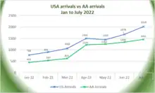 Since the inauguration of American Airlines, there has been a significant increase in U.S. visitor arrivals to the island. A total of 2,019 visitor arrivals were recorded in July 2022, the highest on record (dating back to February 2017, when Ross University operated in Dominica).[17]
