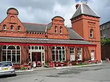 The smaller building that now houses the public and passenger toilet facilities and storage areas was once also used as the railway's own stabling facilities and incorporated porters' accommodation. In more recent times the stables have become garages which are leased out, there being three in total. The fourth old stable has been converted into accommodation and was once used by the night watchman and as storage space. The old porters' rooms were converted into the railway's souvenir shop in 1993 as part of the Year Of Railways and remained as such until the 1999 season when the premises closed and the space was let to the tenants of the station restaurant for storage purposes. When open the shop stocked a range of railway and transport-related publications, videos and magazines as well as a large range of postcards and souvenirs, which are now located at the Isle of Man Railway Museum in Port Erin. What now forms the ladies and gentlemen's' toilets next door was once entirely devoted to the gentlemans' facilities whilst the ladies waiting room was within the administrative structure. This setup was amended when rationalisation of the whole site was carried out in 1979 resulting in the facilities provided today. The toilets are also utilised by customers of the station restaurant and when closed are gated across. At the entrance to the platform there is a shall wooden chalet structure which is used by station staff when checking tickets, it also houses various signage and cleaning equipment. This structure was installed in 1991 replacing an earlier version which was time-expired; this structure was originally in a varnished finish but as part of minor refurbishments in 2009 was painted into the standard maroon and cream livery.