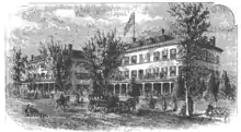 Seeking in New England suitable buildings, Lewis found them in the Lexington House, in Lexington, 10 miles (16 km) from Boston, and 200 feet (61 m) above sea level, this location being free from the fogs of the New England coast. In the spring of 1864, Lewis purchased the Lexington House, which was erected for a hotel, and fitted it up for a school for young ladies at large expense.[3][2] The buildings, accommodating 200 persons, were located on the first battlefield of the American Revolutionary War.[1]