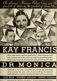 - ↑ Hall, Mordaunt (June 21, 1934). "Doctor Monica (1934): The Screen; Kay Francis, Warren William and Jean Muir in the Picturization of a Polish Stage Work". The New York Times. Archived from the original on March 6, 2016.