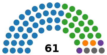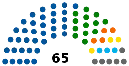 The municipal council consists of sixty-five members elected by mixed-member proportional representation. Thirty-three councillors are elected by first-past-the-post voting in thirty-three wards, while the remaining thirty-two are chosen from party lists so that the total number of party representatives is proportional to the number of votes received.