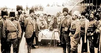 On 12 June 1903, the tsarist authorities passed an edict to bring all Armenian Church property under imperial control. This was faced by strong Armenian opposition because it perceived the tsarist edict as a threat to the Armenian national existence. As a result, the Armenian leadership decided to actively defend Armenian churches by dispatching militiamen who acted as guards and holding mass demonstrations.[4] This prompted Drastamat to join the ranks of the Armenian Revolutionary Federation in order to defend churches from confiscation through public demonstrations and guard duty.[3] In May 1905, using a bomb he carried out the assassination of the governor of Baku, Prince Mikhail Nakashidze,[5] whom the ARF blamed for inciting Tatar attacks against Armenians in Baku.[6] During the Armenian–Tatar clashes of 1905–1907, Dro participated in the organization of Armenian defense militias in the regions of Kotayk, Nakhijevan, and Zangezur.[7] In 1907, Dro assassinated Tsarist general Maksud Alikhanov in Alexandropol.[6] Prior to the Russian Revolution, Dro had killed more than one Russian official.[5]